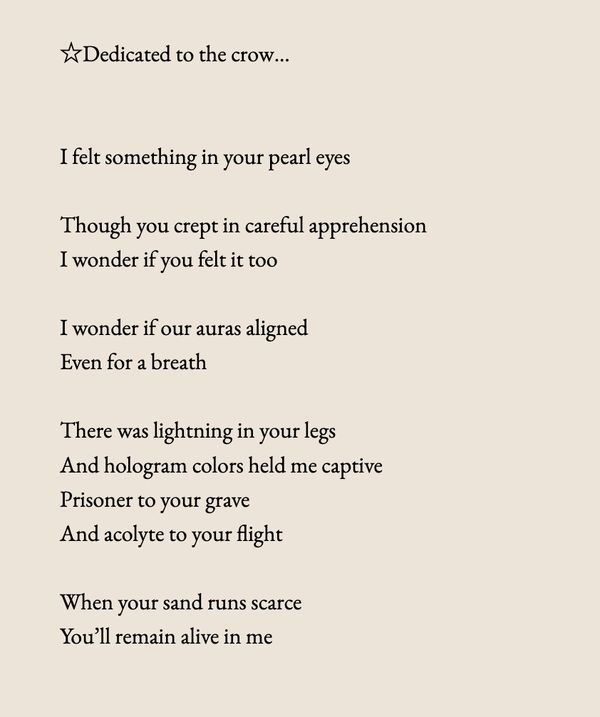 "One day I was walking to class and I saw a flock of crows. All of them flew away but one. For a split second I felt this strange connection, and it was all very odd. It was lightning outside and about to rain, but here this bird was, staring at me. I think I'll always remember this moment, because to me it was a beautiful metaphor for individualism and connection with the Earth." - Lazzaro